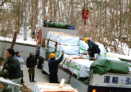 いつもの様に静かにスタート、それは各自が主要なポイントを確実に おさえて安全に気を引き締めてキチッと組み付けていきます。 共同作業は声をかけて安全に・・・気持ちのつながりが大事。 |